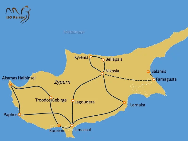 Große Rundreise Zypern – Zypern lädt mit mehr als 300 Sonnentagen, malerischen Buchten, kristallklarem Wasser und traumhaften Sandstränden zu dieser 10-tägigen Reise ein. Gleichzeitig bietet die drittgrößte Mittelmeerinsel durch griechische und orientalische Kultureinflüsse eine Vielzahl historischer Funde und interessanter Sehenswürdigkeiten. Aufgrund des ausgeprägten Mittelmeerklimas sind die Winter frühlingshaft mit einer reichen Wildblüte und einer Badesaison bis in den November. Ostern: Erleben Sie das wichtigste griechisch-orthodoxe Fest. Sie nehmen gemeinsam mit Ihrer Reiseleitung an der Karfreitagsprozession und der Mitternachtsmesse in Nikosia teil.