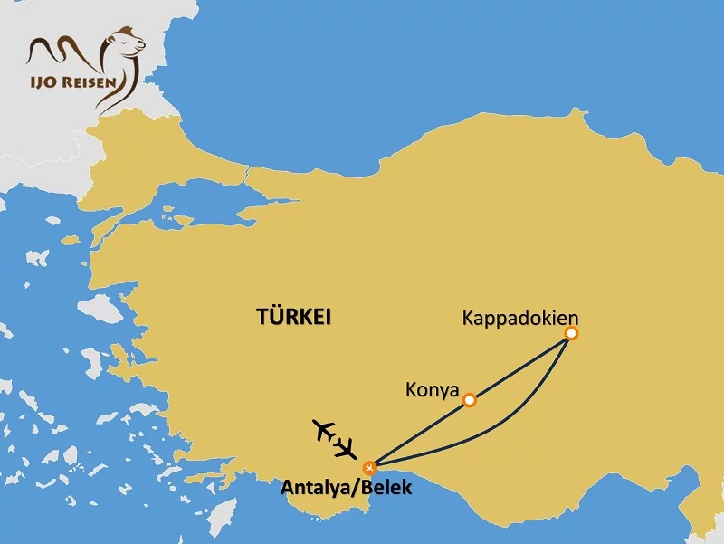 1. Tag – Anreise Flug von Stuttgart, München, Berlin, Dresden, Köln, Düsseldorf, Fankfurt, Hannover oder Hamburg nach Antalya. Empfang und Transfer zu Ihrem Hotel. Abendessen und Übernachtung in der Region Antalya oder Belek.2. Tag – Antalya/Belek – Konya – Kappadokien (ca. 520 km)Heute heißt es früh aufstehen. Nach einem stärkenden Frühstück fahren Sie in Richtung Taurusgebirge und Kappadokien. Unterwegs machen Sie einen Stopp in Konya und besuchen die Grabmoschee von Mevlana, dem Gründer des Mevlana Ordens. Zu Ehren des 1273 verstorbenen Celaleddin Rumi wurde hier ein Grabmal mit 65 Särgen für ihn, seine Verwandten und die ihm nachgefolgten Klostervorsteher errichtet. Dieser Orden ist für seine tanzenden Derwische bekannt, die sich während ihrer Meditationen so schnell im Kreis drehen, dass die weißen Gewänder fliegen. Anschließend Weiterfahrt nach Kappadokien. Übernachtung in der Region Kappadokien.3. Tag – Kappadokien (ca. 70 km) Nach dem Frühstück wird es aktiv: Sie wandern durch die traumhaften Täler Kappadokiens (ca. 1.5-2 km; Dauer: ca. 1.5-2 Stunden). Die Wanderroute ist leicht bis mittelschwer, festes Schuhwerk ist erforderlich. Sie führt vorbei an beeindruckenden Gesteinsformationen dieser faszinierenden Mondlandschaft. Eine anschließende Rundfahrt durch Kappadokien bringt Sie zu einigen schönen Fotopunkten. Diese unwirkliche Welt, wie aus Zuckerguss geschaffen, wird einen bleibenden Eindruck hinterlassen. Übernachtung und Abendessen im Hotel des Vortages.4. Tag – Kappadokien (ca. 100 km)Das berühmte Rote Tal erwartet Sie. Die markante Farbe wird Sie begeistern! Beobachten Sie, wie die verschiedenen Gesteinsschichten aufeinandertreffen. In einer Teppichknüpferei lernen Sie die älteste Handwerkskunst der Türken kennen und sehen, wie kunstvolle Teppiche geknüpft werden (inklusive Präsentation, Beratung und Einkaufsmöglichkeiten). Anschließend besuchen Sie die Töpferstadt Avanos und erfahren mehr über das türkische Handwerk. Schauen Sie gerne nach einem handgefertigten Souvenir zur Erinnerung. Eine besondere Möglichkeit, diese Region intensiv zu erleben, ist eine Ballonfahrt über die Täler Kappadokiens (wetterabhängig, vor Ort buchbar, Preis saisonabhängig). Diese findet in den frühen Morgenstunden an Tag 3, 4 oder 5 statt. Aus der Vogelperspektive wirkt Kappadokien wie eine Märchenlandschaft! Übernachtung und Abendessen im Hotel des Vortages.5. Tag – Kappadokien (ca. 80 km) Heute steht Ihnen der Tag zur freien Verfügung. Wenn Sie das Ausflugspaket gebucht haben, besuchen Sie das Freilichtmuseum Göreme mit seinen berühmten Höhlenkirchen. Erkunden Sie die großen und kleinen Höhlen und lassen Sie sich von den gut erhaltenen Fresken in eine andere Zeit zurückversetzen. Danach besuchen Sie eine der vielen unterirdischen Städte der Region. Hier fanden einst Christen Zuflucht und lebten in den Höhlensystemen. Achten Sie auf Ihren Kopf, einige Gänge sind sehr schmal. Heute erhalten Sie zusätzlich ein Mittagessen. Abendessen und Übernachtung im Hotel des Vortages.6. Tag – Kappadokien – Antalya/Belek (ca. 500 km)Am frühen Morgen geht es zurück nach Antalya. Herrliche Landschaften auf der Seidenstraße ziehen an Ihnen vorbei. Sie halten an einer ehemaligen Karawanserei und besichtigen den Innenhof, die Ställe und die Quartiere. Abendessen und Übernachtung in der Region Antalya oder Belek.7. Tag – Antalya (ca. 90 km)Heute besuchen Sie Antalya. Das Rauschen der tosenden Karpuzkaldiran-Wasserfälle und die beeindruckende Aussicht werden Ihnen in Erinnerung bleiben. Im Laufe des Tages haben Sie die Möglichkeit, Schmuck- und Lederwaren zu kaufen (inkl. Präsentation und Beratung). Bringen Sie Ihren Lieben zu Hause eine Kleinigkeit mit. Anschließend fahren Sie in die Altstadt von Antalya. Mit ihrem beliebten Hafen, der urig verwinkelten Altstadt und dem mediterranen Klima zählt Antalya zu den schönsten Städten der Türkei. Die Stadt ist ein beliebter Ankerplatz für Yachten aller Bauarten. Bestaunen Sie die imposanten Schiffe, während Sie am Hafen entlang schlendern. Bei den zahlreichen Händlern finden Sie bestimmt ein kleines Mitbringsel. Übernachtung in der Region Antalya oder Belek.8. Tag – Abreise Heute nehmen Sie Abschied von der Türkei. Transfer zum Flughafen und Rückflug nach Deutschland.